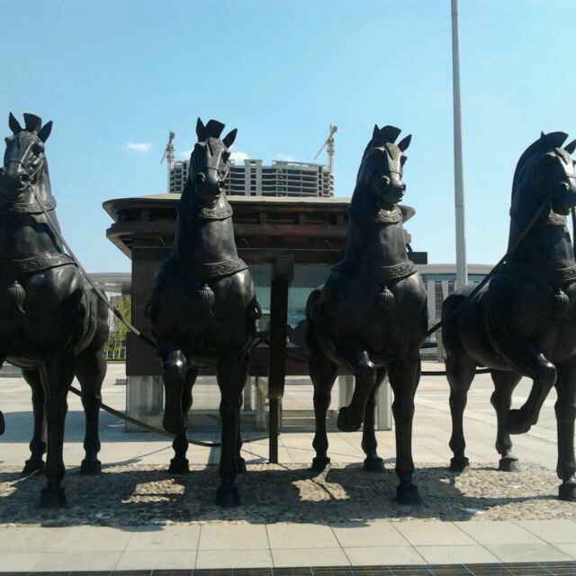 濟(jì)南西客站東廣場(chǎng)疏散口銅車馬雕塑群,材質(zhì):青銅鑄造、鍛銅;長(zhǎng)度15米,高度4.5米;共6組。 雕塑以四馬一車為一組,自高鐵西站東廣場(chǎng)